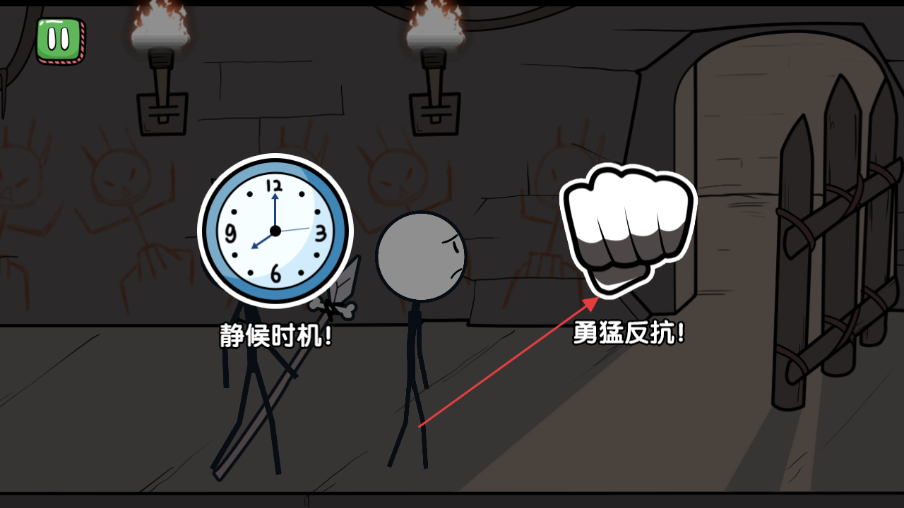 2、根據(jù)情況選行動(如選“勇猛反抗”),觸發(fā)戰(zhàn)斗,操控火柴人對抗敵人(如躲避、攻擊)。