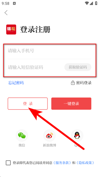 3、在登錄注冊頁面輸入手機(jī)號、短信驗(yàn)證碼,點(diǎn)擊登錄完成操作。