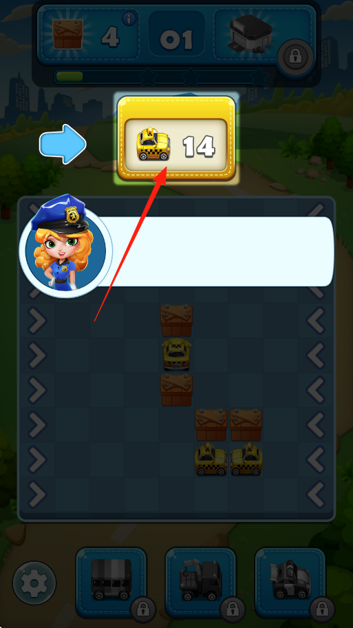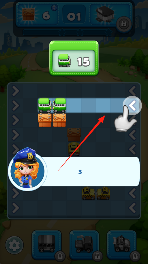 2、按提示滑動(dòng)方向鍵,移動(dòng)對(duì)應(yīng)車(chē)輛,避開(kāi)障礙,為目標(biāo)車(chē)輛騰出通行空間。