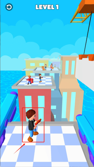1、初始關(guān)卡中控制紅框角色在藍(lán)白平臺(tái)移動(dòng),觀察周圍玩家與環(huán)境互動(dòng),注意右上角吊鉤可能觸發(fā)特殊機(jī)制。