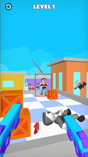 3、城市屋頂關(guān)卡需持槍瞄準(zhǔn)畫框敵人射擊,巧妙利用橙色箱子作為掩體,完成擊敗目標(biāo)推進(jìn)關(guān)卡進(jìn)度。