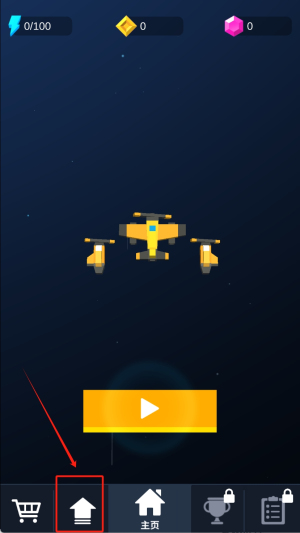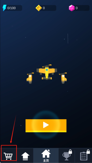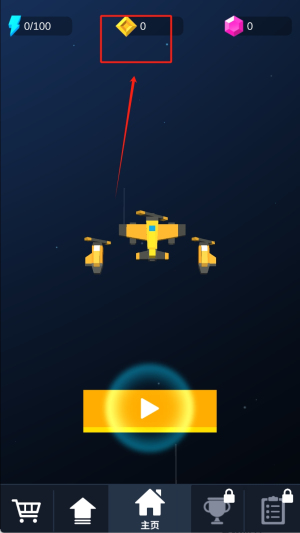 1、進(jìn)入游戲主界面查看能量值與資源數(shù)量,點(diǎn)擊中央橙色播放鍵開始空戰(zhàn),注意左下角紅框購物車可購買道具。