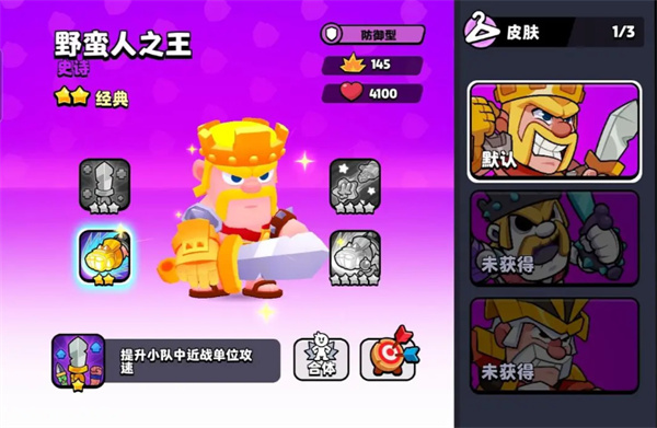 1、野蠻人之王:史詩(shī)品質(zhì),等級(jí)145,生命值4100,定位防御型,技能可提升小隊(duì)近戰(zhàn)單位攻速,皮膚含默認(rèn)等3款(1/3解鎖),作為團(tuán)隊(duì)前排,靠增益buff強(qiáng)化近戰(zhàn)協(xié)同。