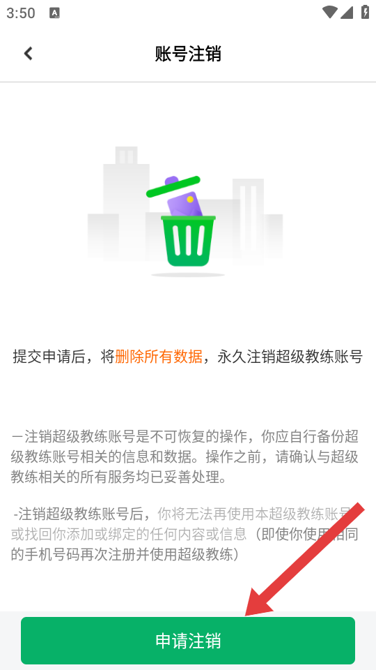 3、在賬號(hào)注銷(xiāo)的頁(yè)面,仔細(xì)閱讀注銷(xiāo)說(shuō)明后,點(diǎn)擊綠色的申請(qǐng)注銷(xiāo)按鈕。