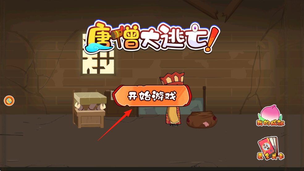 1、點(diǎn)擊【開始游戲】,操控唐僧,向右滑動(dòng)屏幕(紅箭頭),躲避妖怪追捕。