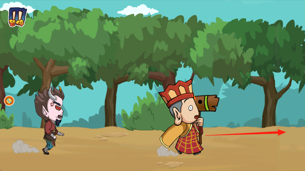 2、在樹林場(chǎng)景,持續(xù)右移(紅箭頭),利用地形(樹木)阻擋妖怪,保持逃亡節(jié)奏。