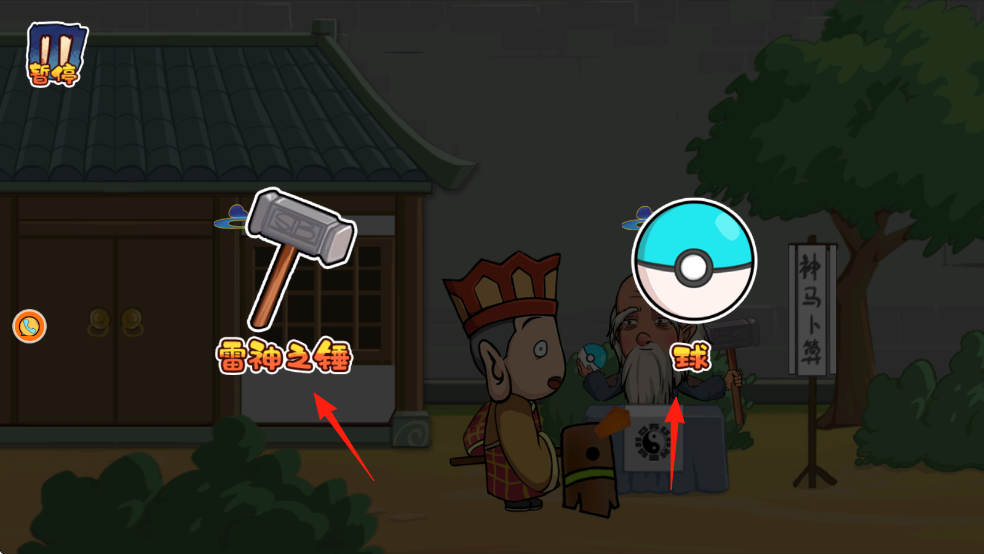3、到達(dá)“神馬小算”處,選擇道具(雷神之錘,精靈球,紅箭頭),用錘子攻擊,球捕捉,擺脫威脅。