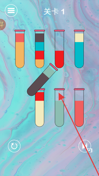 3、遇到混合試管,先倒出占比小的顏色,給目標(biāo)試管騰出空間,利用“重置”按鈕(左下角)調(diào)整,確保同色液體歸位,通關(guān)解鎖新關(guān)卡。