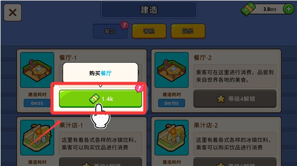 2、擁有足夠多的貨幣后,點(diǎn)擊建造即可建造餐飲、客艙以及各種娛樂設(shè)施,注意有些建造需要達(dá)到相應(yīng)的等級要求。