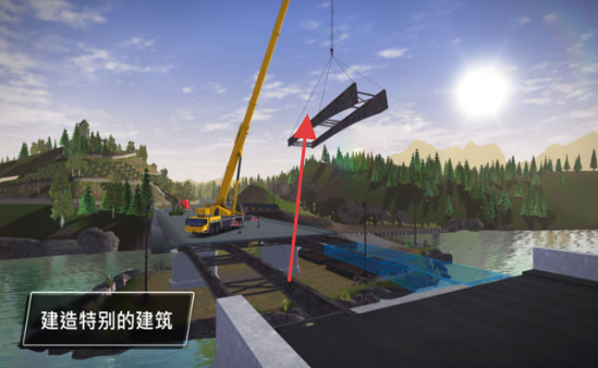 2、在橋梁建造關卡,操作起重機,吊起鋼梁,對準橋墩安裝,按指引完成“建造特別的建筑”目標,學習大型設備使用。