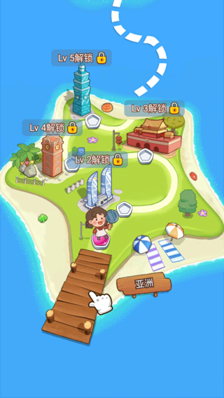1、呈現(xiàn)的是“亞洲”區(qū)域的地圖,有不同等級(jí)解鎖的建筑,如Lv2解鎖、Lv3解鎖、Lv4解鎖、Lv5解鎖的建筑,還有角色站在木板橋上,體現(xiàn)地圖探索與等級(jí)解鎖玩法。