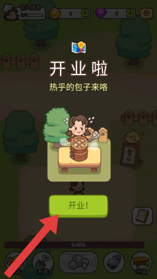 2、角色處于開業(yè)啦階段,點(diǎn)擊【開業(yè)!】按鈕,還有初入境界Lv.1等等級(jí)信息,以及金幣、鉆石等資源顯示,下方有商店、新建、升級(jí)等功能按鈕。