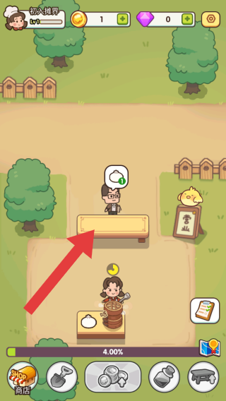 3、場(chǎng)景里有樹木、圍欄,還有人物(包子制作角色、顧客角色),以及商店等功能按鈕,屬于經(jīng)營(yíng)包子店的玩法。
