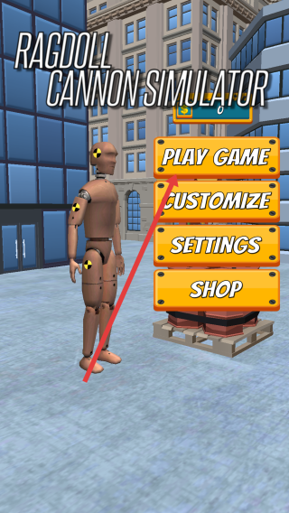 1、在啟動頁,點(diǎn)擊【PLAY-GAME】,進(jìn)入【Ragdoll-Cannon-Simulator】,開始布娃娃發(fā)射挑戰(zhàn)。