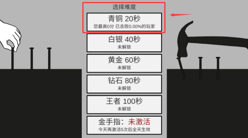 1、核心玩法簡單純粹,通過精準點擊將釘子敲入目標位置,隨著游戲進程,目標會變換位置、移動速度加快,考驗玩家的反應速度和手眼協(xié)調能力。