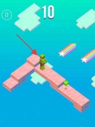 2、游戲環(huán)節(jié):角色在云端方塊路徑移動,分數(shù)10,收集彩虹等道具,避開掉落。