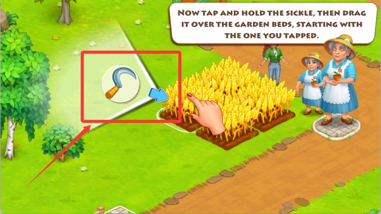 3、點(diǎn)擊小麥后滑動鐮刀的圖標(biāo)到小麥上就收割完成了。