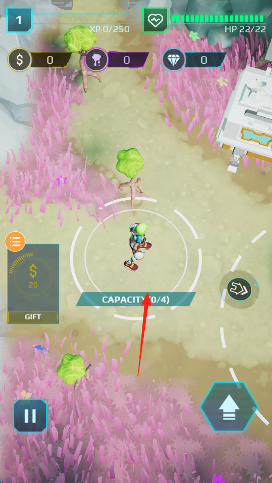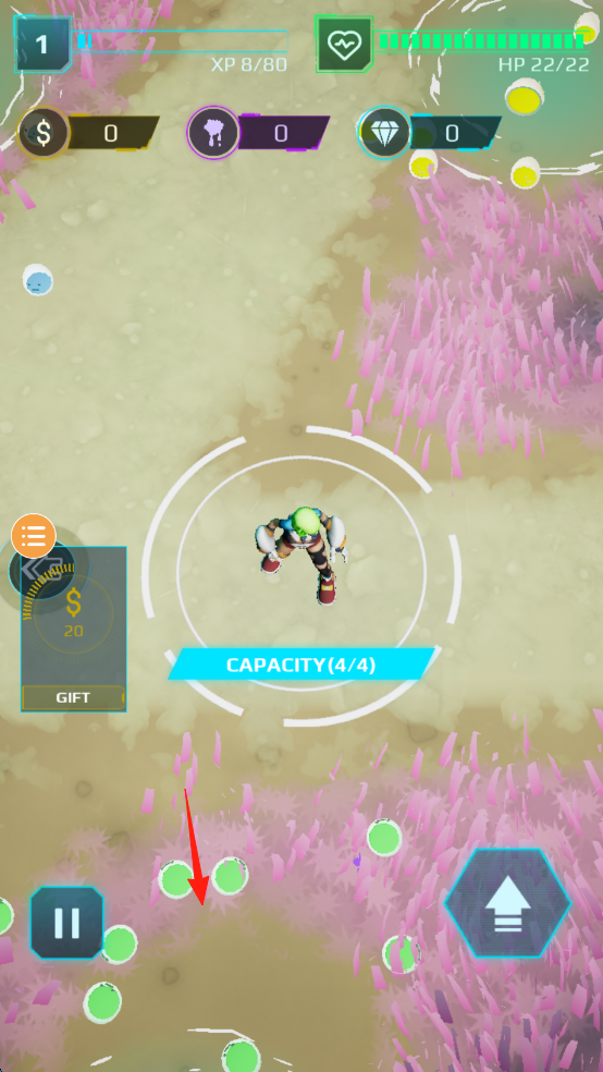 2、觀察“CAPACITY(0/4)”(紅箭頭),靠近綠色史萊姆,自動收集,填滿容量(4/4),積累資源。