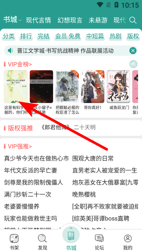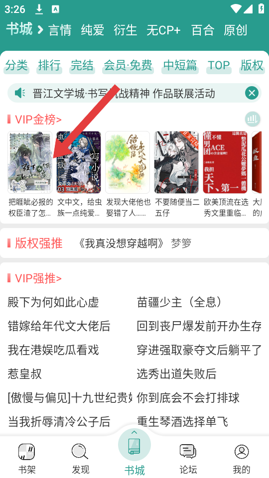 1、在晉江小說(shuō)閱讀書(shū)城頁(yè)面,點(diǎn)擊要閱讀的小說(shuō),進(jìn)入小說(shuō)詳情界面。