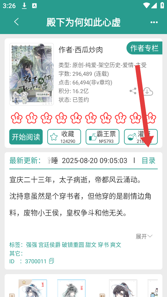 1、在晉江書(shū)城的界面,先找到想閱讀的小說(shuō)如示例中殿下為何如此心虛,點(diǎn)擊進(jìn)入小說(shuō)的詳情頁(yè)面。