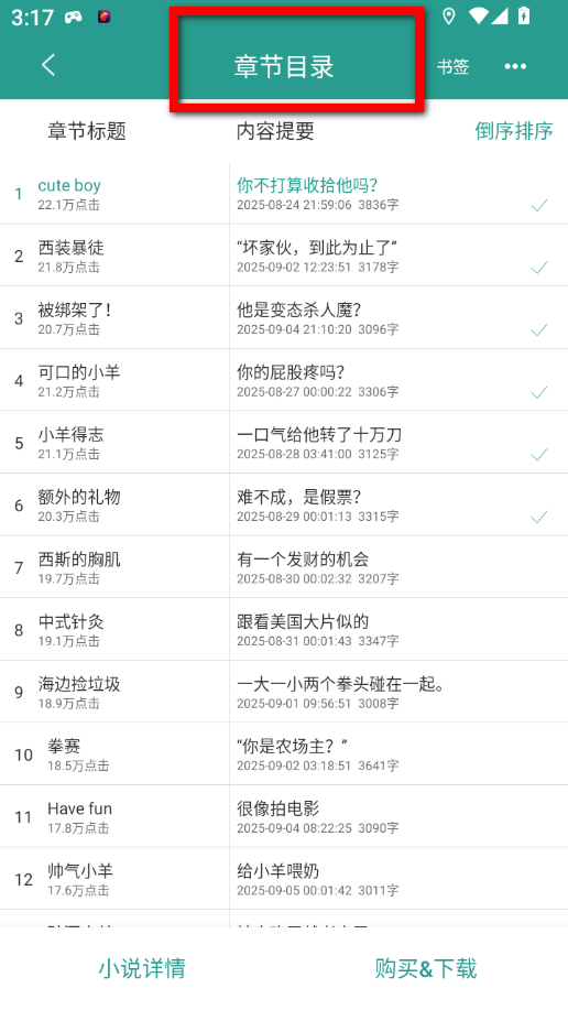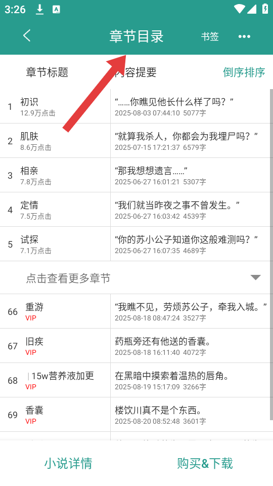 4、點(diǎn)擊后,即可查看該小說(shuō)的章節(jié)目錄,能看到章節(jié)標(biāo)題、內(nèi)容提要等信息。