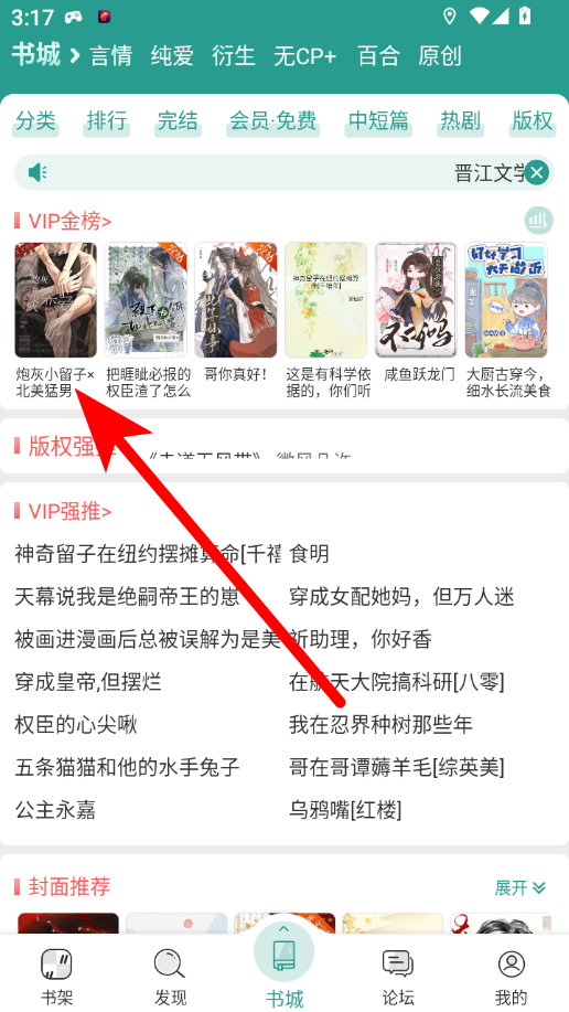 1、在晉江小說(shuō)閱讀書(shū)城頁(yè)面,找到并點(diǎn)擊目標(biāo)小說(shuō),進(jìn)入小說(shuō)詳情界面。