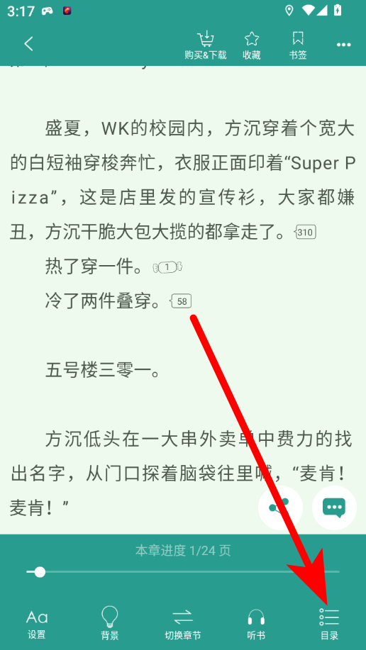 3、在小說(shuō)閱讀界面,點(diǎn)擊屏幕,喚起功能欄,然后點(diǎn)擊右下角目錄選項(xiàng)。