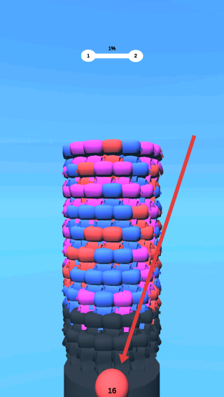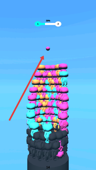 2、搭建階段,按箭頭指引,精準(zhǔn)放置粉色球體,穩(wěn)固“彩色小人堆疊”的高塔,提升高度與層數(shù)。