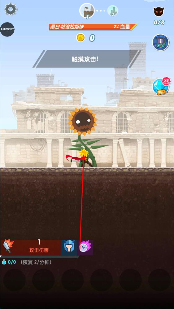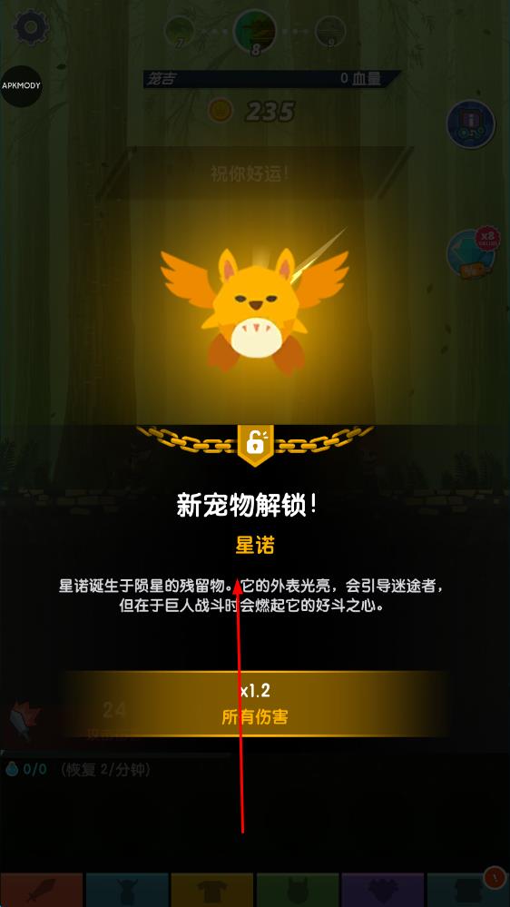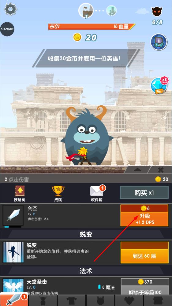 1、初入游戲,玩家將置身于手繪王國,通過點(diǎn)擊操作擊殺泰坦,獲取聲望和現(xiàn)金,開啟冒險(xiǎn)第一步。