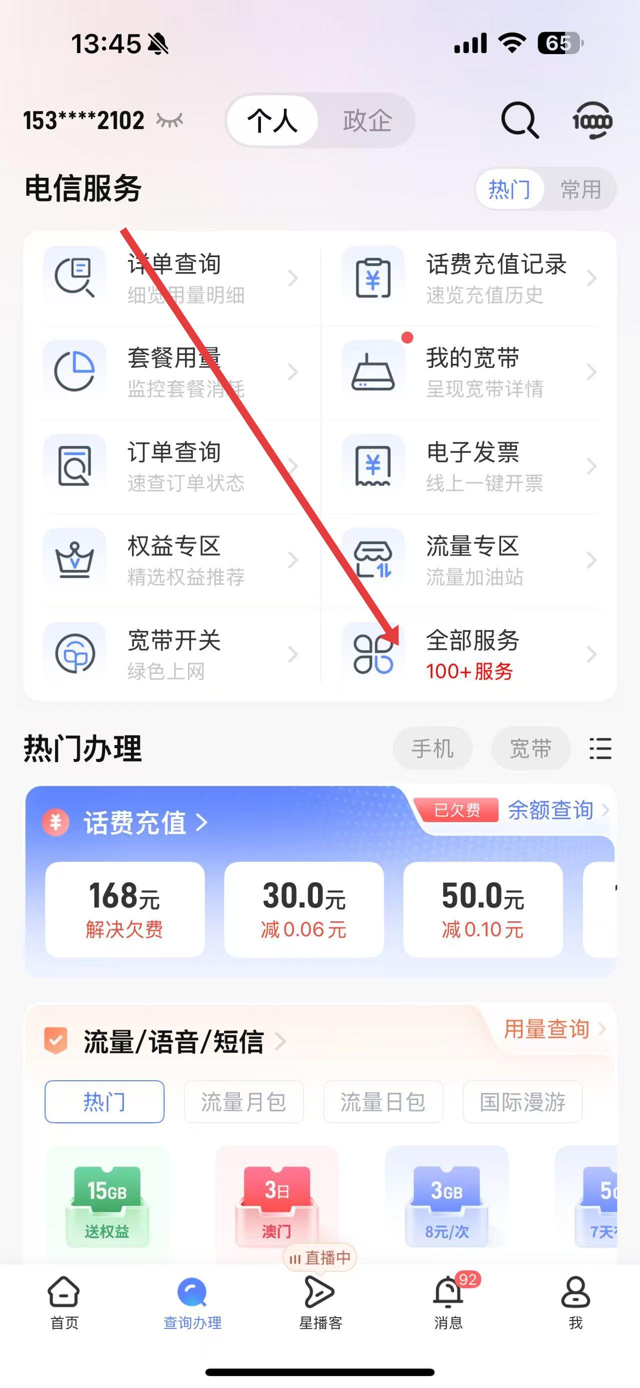 2、在電信服務(wù)界面中,點擊全部服務(wù),進(jìn)入服務(wù)大廳,查找與業(yè)務(wù)相關(guān)的查詢服務(wù)選項。