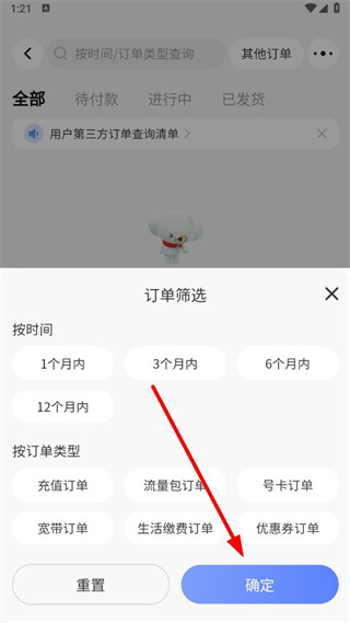 4、在訂單篩選頁面,選擇按時間和訂單類型的篩選條件后,點擊確定按鈕,即可查看符合條件的訂單。