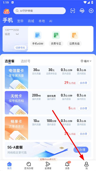 1、打開中國電信app,點擊底部導(dǎo)航欄中的我選項。