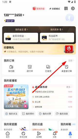 2、在我的頁面,點擊我的訂單右側(cè)的全部選項,進(jìn)入全部訂單頁面。