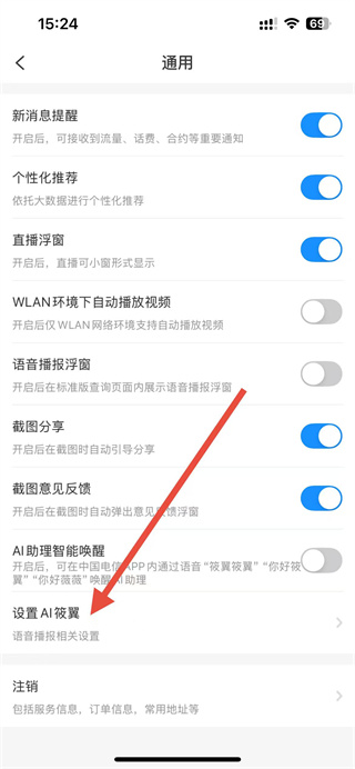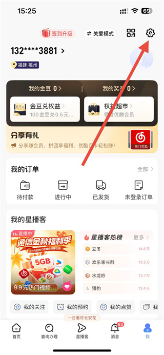 1、在中國電信App我的頁面,點擊右上角設(shè)置圖標(biāo),進(jìn)入設(shè)置界面。