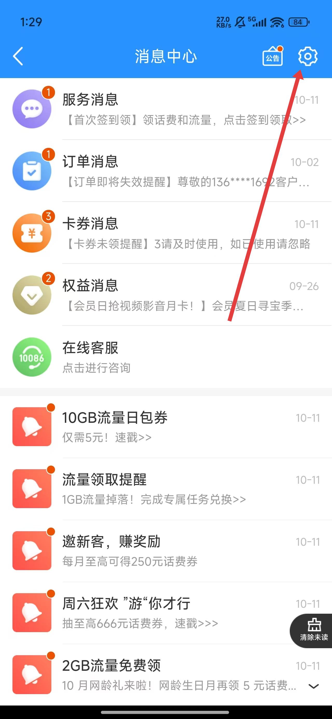 3、在進入到消息中心頁面,可以點擊右上角齒輪圖標(biāo),進行設(shè)置操作。