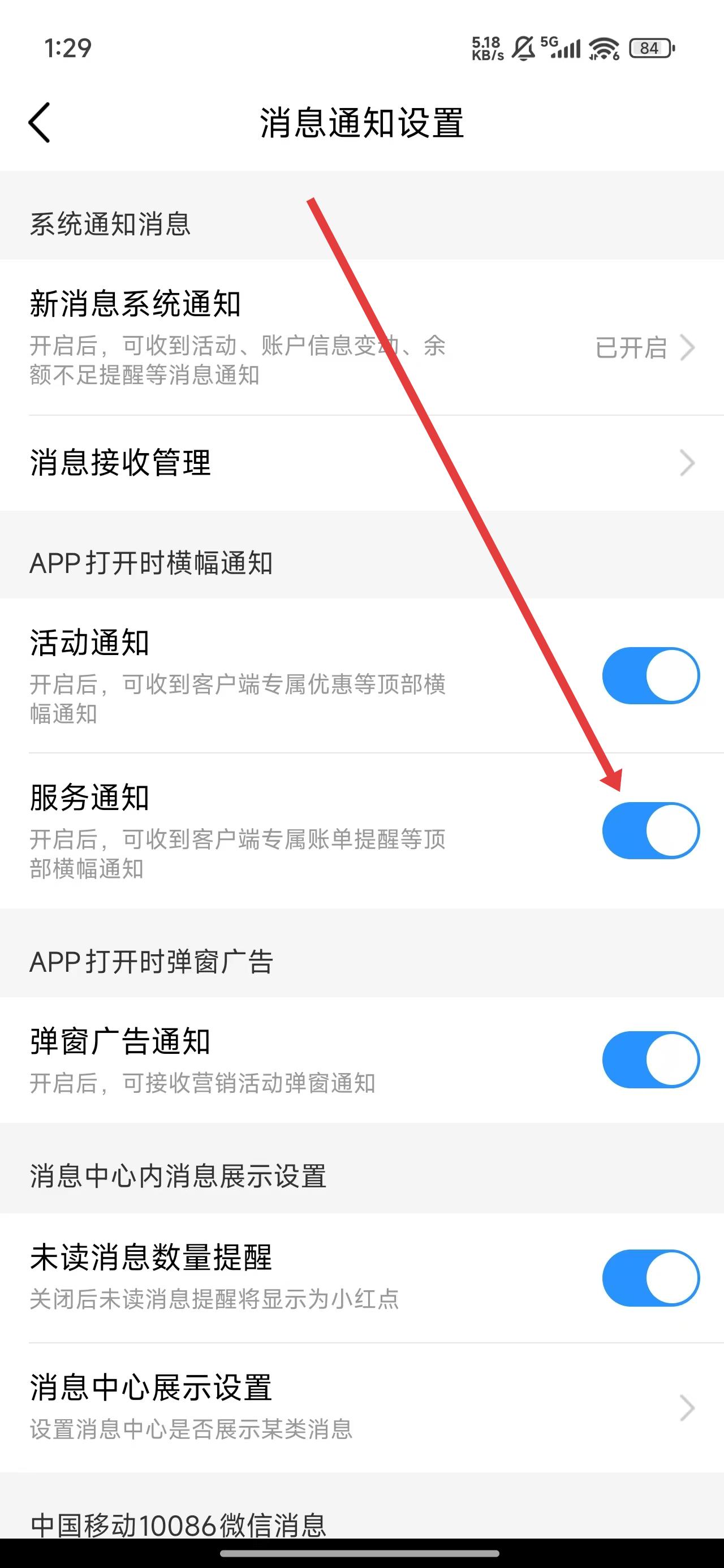 4、進入到消息通知設(shè)置頁面后,若想取消服務(wù)通知功能,可以點擊開關(guān)按鈕,關(guān)閉該功能。