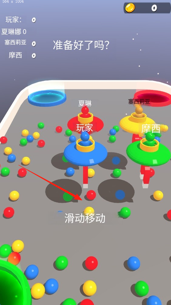 1、滑動屏幕控制角色移動,收集彩色小球,躲避其他玩家,將球投入對應顏色池。
