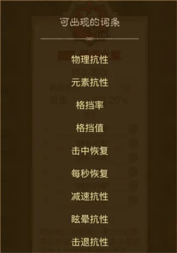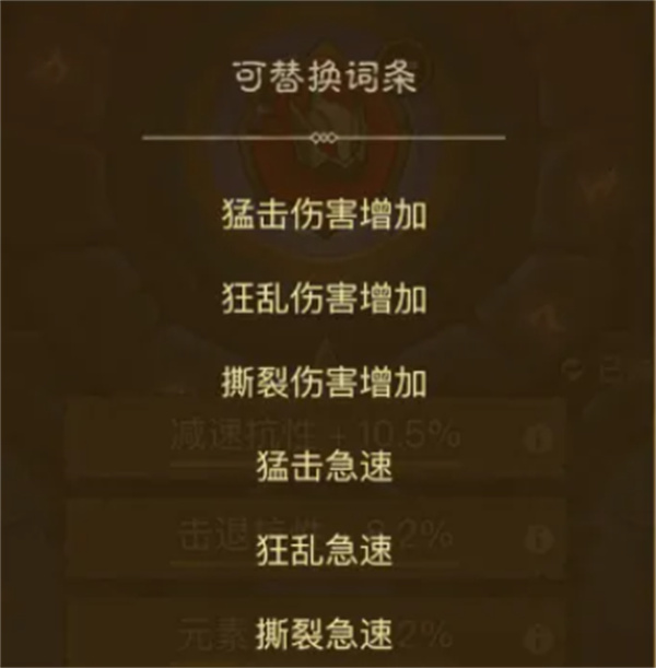 控制抗性:減速抗性減少控制時間,頂級詞條減免40%;眩暈抗性降低控制概率,頂級詞條減免40%;擊退抗性減少位移距離,頂級詞條減免50%。