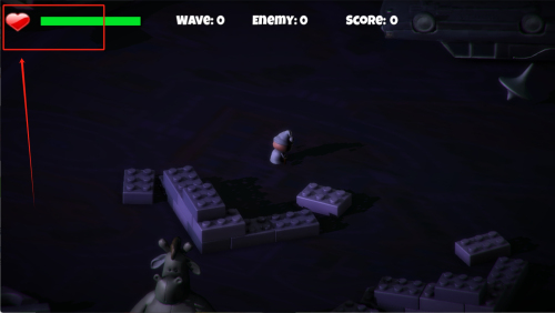 2、操控角色在紫色積木場(chǎng)景中移動(dòng),注意左上角紅框內(nèi)愛心代表生命值,綠色長(zhǎng)條為能量槽,避開敵人攻擊并收集道具補(bǔ)充狀態(tài)。