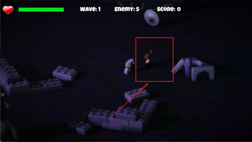 3、當(dāng)波數(shù)顯示為1且敵人數(shù)量為5時(shí),利用場(chǎng)景障礙物掩護(hù),瞄準(zhǔn)紅框標(biāo)記的靠近敵人進(jìn)行攻擊,每擊敗一個(gè)獲得相應(yīng)分?jǐn)?shù)。