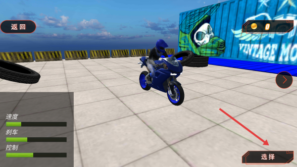 2、在摩托選擇頁,選藍色摩托,點【選擇】,確定參賽車輛。