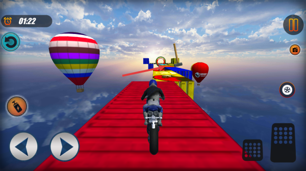 3、進入特技賽道,用虛擬按鍵控摩托,沖過紅跑道,避障礙,完成特技挑戰(zhàn)。