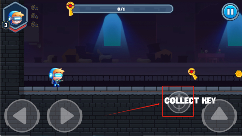 1、在初始場(chǎng)景中操控角色向左移動(dòng),注意收集紅框標(biāo)記的黃色鑰匙,屏幕上方顯示"0/1"提示還需獲取鑰匙,避開(kāi)障礙物確保安全。