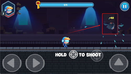 2、遇到敵人時(shí)按住底部"HOLD TO SHOOT"按鈕瞄準(zhǔn),將準(zhǔn)星對(duì)準(zhǔn)紅框內(nèi)目標(biāo)后松開(kāi)射擊,成功擊敗可獲得"+40"分?jǐn)?shù)獎(jiǎng)勵(lì)。