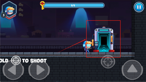 3、接近關(guān)卡末尾時(shí)尋找紅框標(biāo)注的藍(lán)色裝置,按照"OLD TO SHOOT"提示進(jìn)行特殊互動(dòng),觸發(fā)機(jī)關(guān)開(kāi)啟通關(guān)路徑完成關(guān)卡。