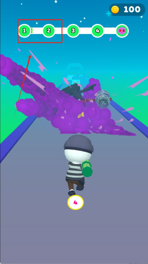 2、操控戴帽角色向前奔跑,避開紫色煙霧障礙,觀察腳下黃色圓圈標注的數(shù)值4,保持最佳移動速度。