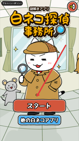 1、在游戲的啟動(dòng)頁面,點(diǎn)擊【スタート】,啟動(dòng)【白貓偵探事務(wù)所】,跟隨白貓偵探,開啟解謎冒險(xiǎn)之旅。