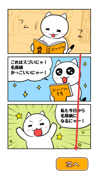2、瀏覽劇情漫畫,了解白貓成為名偵探的決心,點(diǎn)擊【次へ】,推進(jìn)劇情,進(jìn)入關(guān)卡選擇。