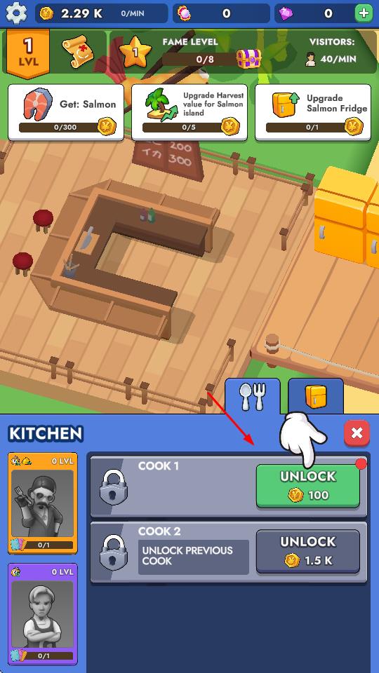1、在“KITCHEN”界面,消耗金幣解鎖廚師,擴(kuò)充廚房人力,提升菜品制作效率,滿足顧客需求。