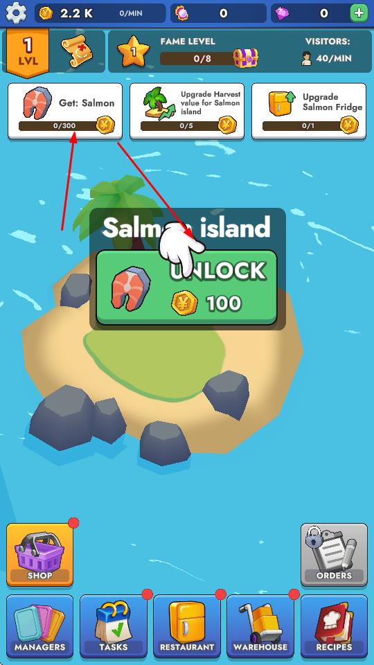 2、花費(fèi)金幣解鎖資源島,獲取特定資源,完成任務(wù),為餐廳提供食材供應(yīng)。